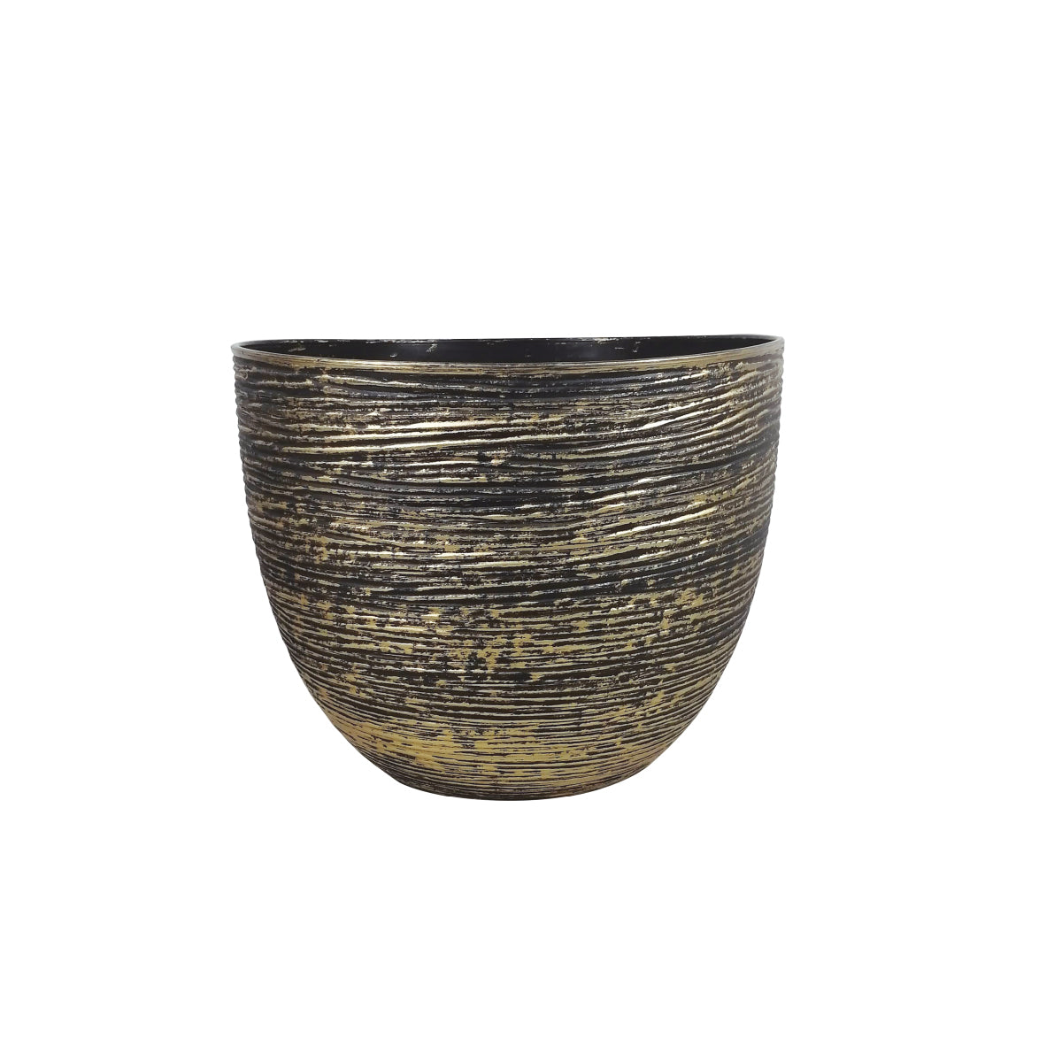 Agrega elegancia y textura a tu decoración con esta maceta redonda de cerámica estilo rústico, disponible en tonos negro o dorado envejecido. Su acabado artesanal con líneas grabadas aporta un toque natural y sofisticado que combina perfectamente con estilos modernos, boho o contemporáneos.
