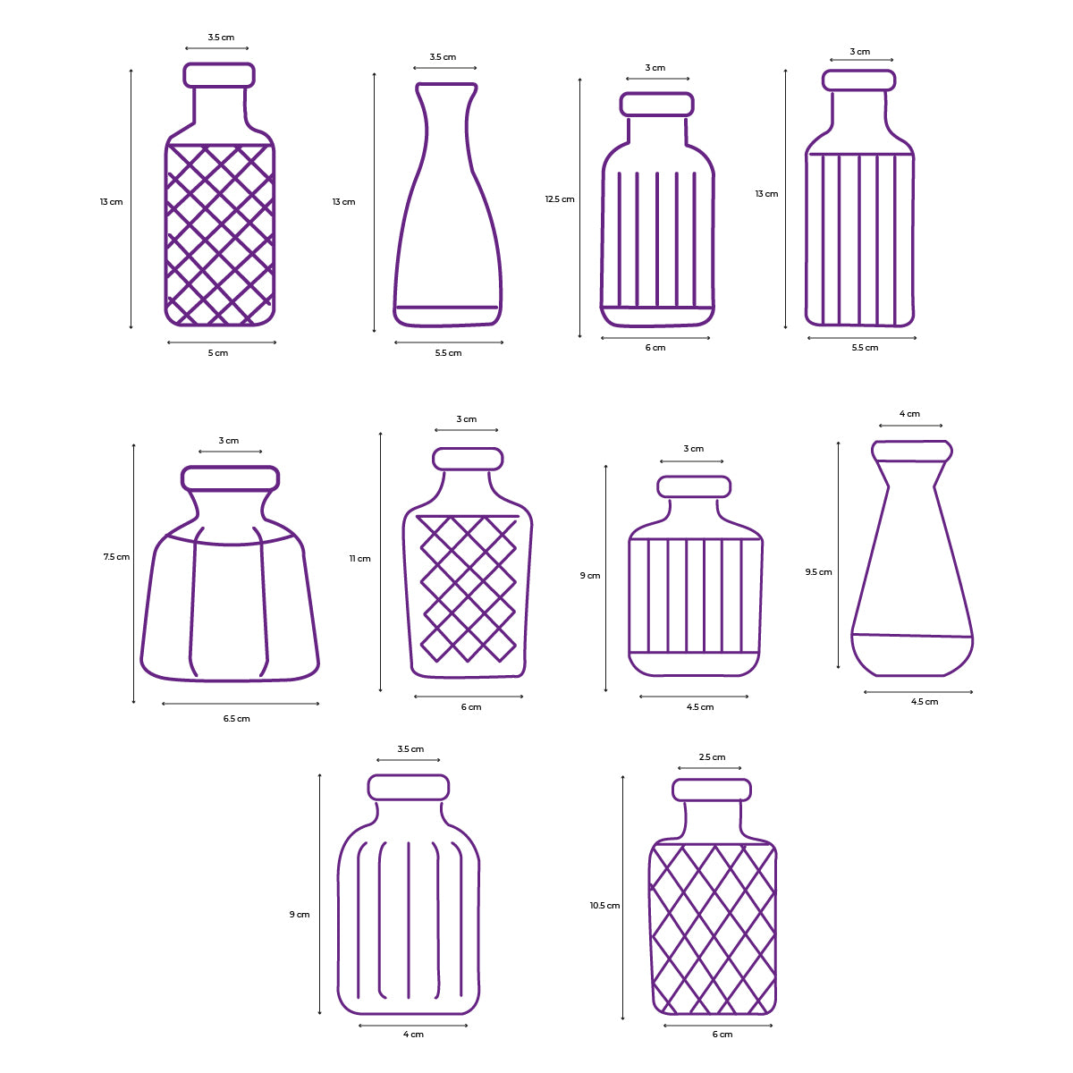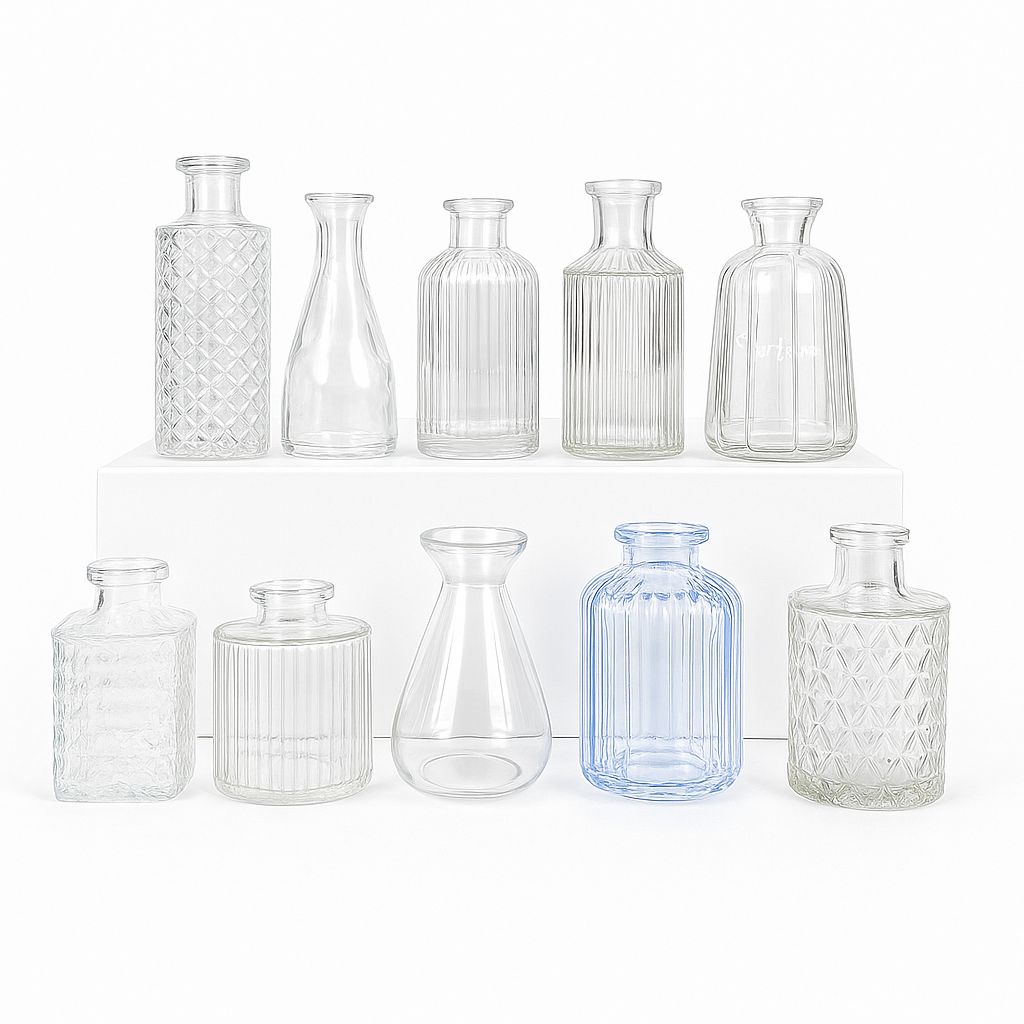 Añade un toque único y sofisticado a tu decoración con este paquete de 10 jarrones de vidrio transparente, cada uno con un diseño de textura diferente. Su estilo elegante y versátil los convierte en el complemento ideal para centros de mesa, arreglos florales o detalles decorativos.