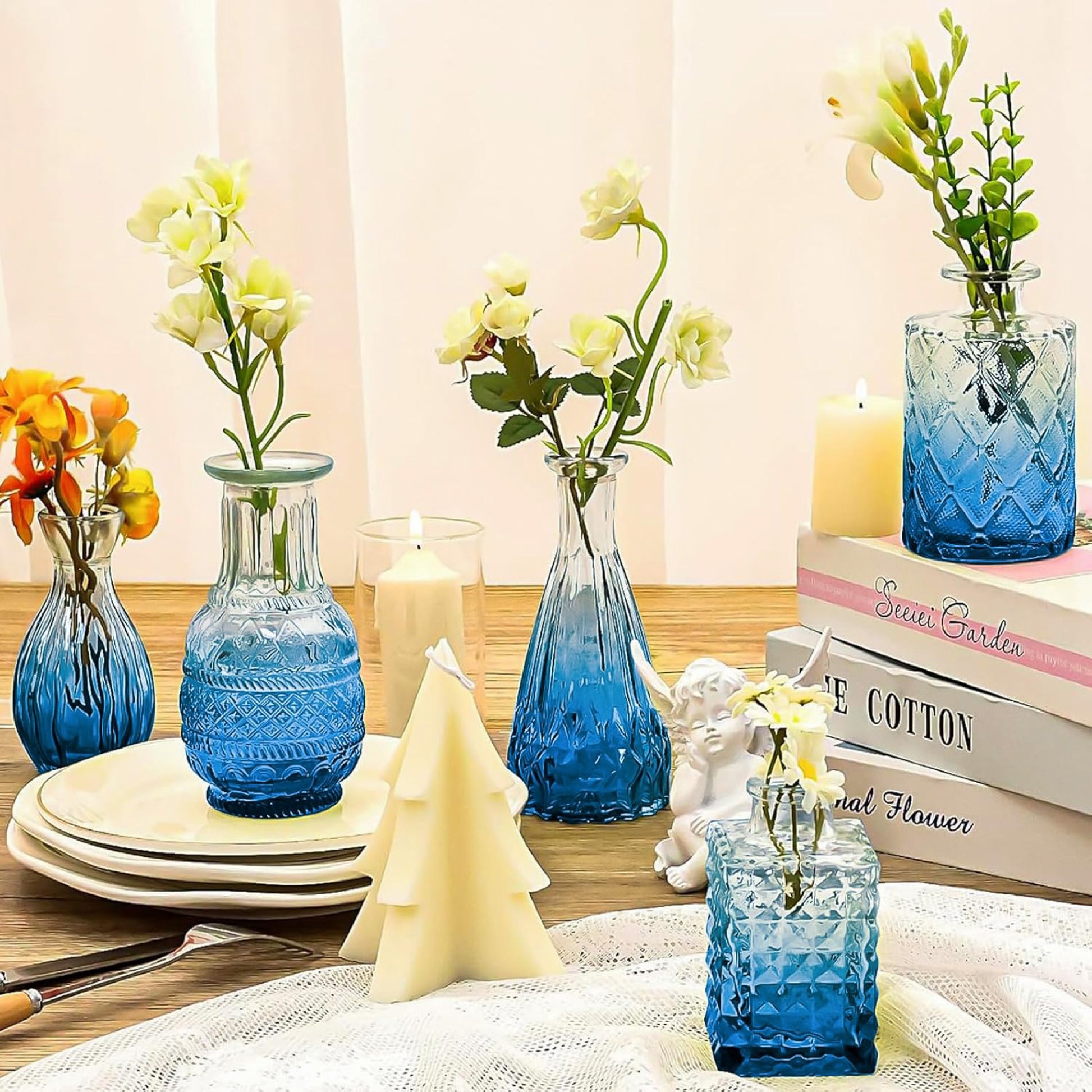 Este set de jarrones de vidrio azul texturizado combina estilo, elegancia y un toque vintage que realza cualquier espacio. Incluye varios jarrones pequeños con diferentes formas y diseños en relieve, perfectos para arreglos florales individuales, flores secas, tallos decorativos o centros de mesa.